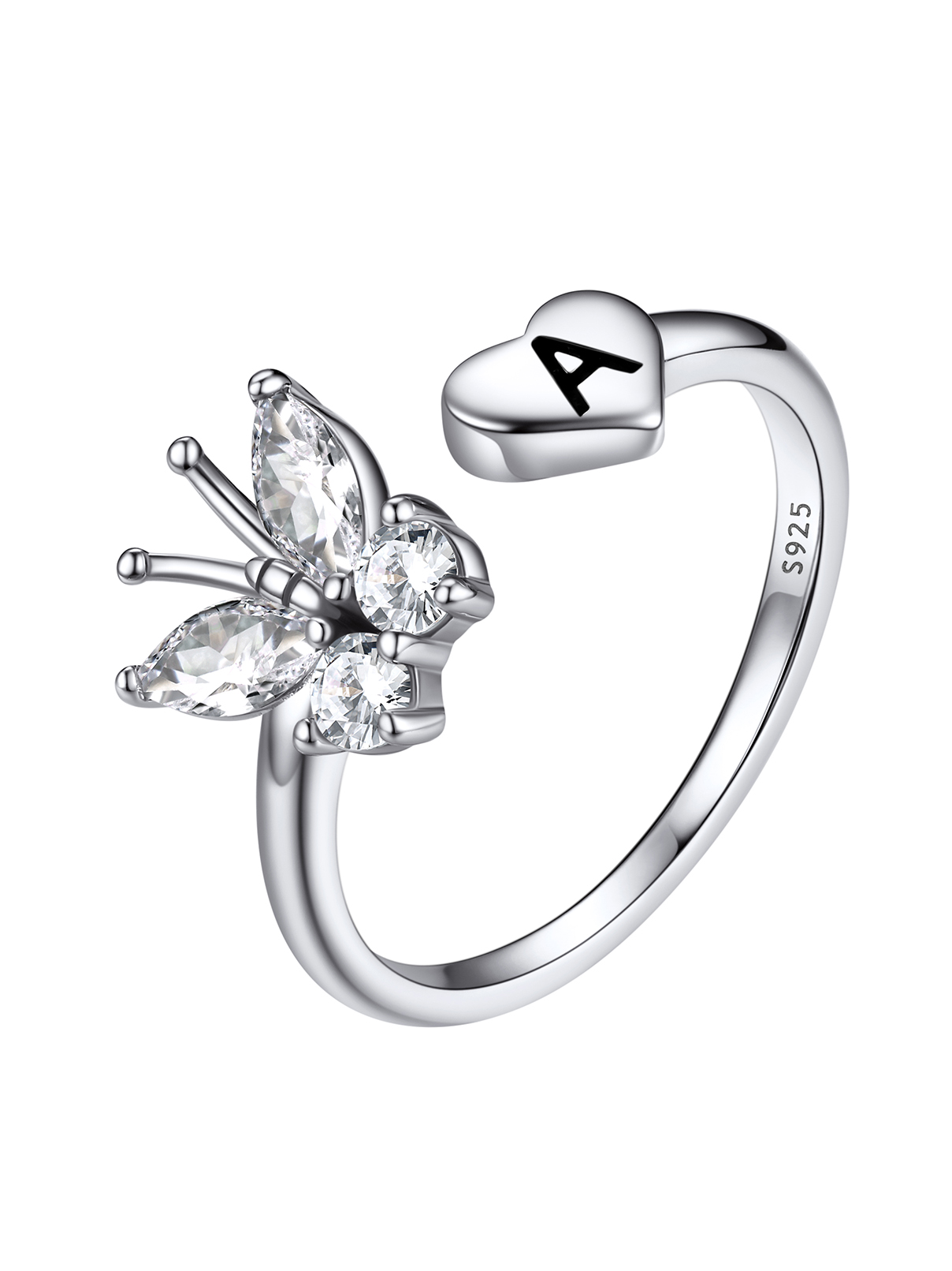 FaithHeart Sterling Silver Butterfly Initial Rings for Women Adjustable Open Stackable Heart Finger Ring Dainty Cubic Zirconia Jewelry Gift Letter A